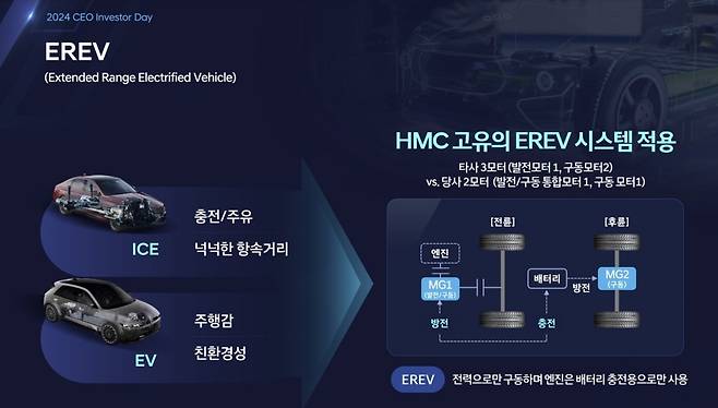 전기차의 장점인 전기 주행 감각을 최대한 살리되, 충전 인프라와 심리적 불안(레인지 애너티)을 완충하는 역할을 한다. 현대차그룹이 2027년부터 EREV를 출시하겠다는 계획을 공식적으로 언급한 점은 그래서 의미가 크다. 전기차 캐즘 구간에서 소비자가 실제로 부담을 느끼는 지점을 정면으로 겨냥한 해법이기 때문이다.