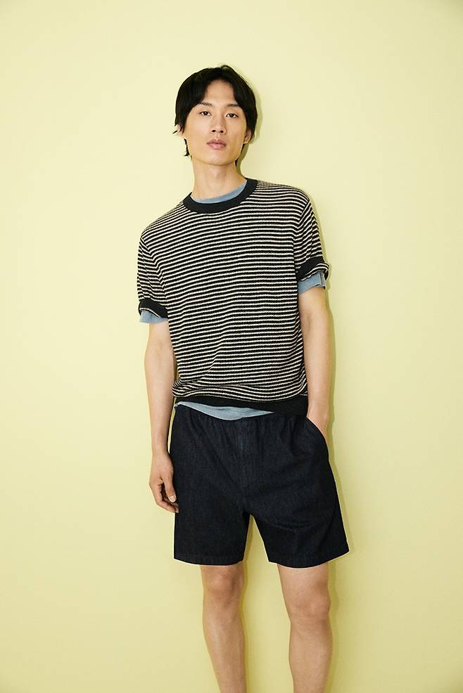 무릎 위 기장의 데님 반바지를 데님 반소매 셔츠와 셋업으로 코디하거나, 스트라이프 티셔츠, 체크 셔츠와 연출했다.