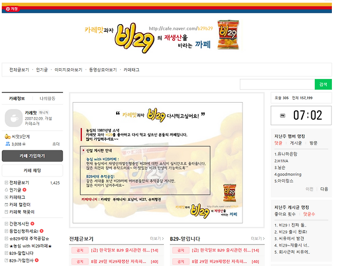 네이버 카페의 요구를 포함 비29를 찾는 사람들이 늘어나자 농심에서 1991년 단종됐던 과자 '비29'를 2009년 18년만에 재출시했어요.