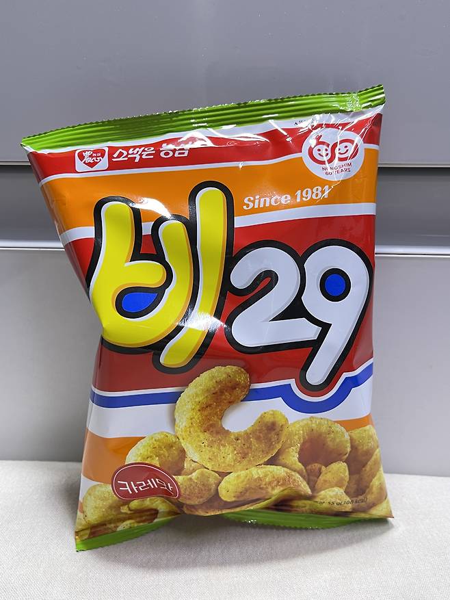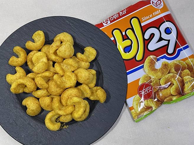 비29는 옥수수로 만든 초승달 모양의 카레맛 과자로 전국 대형마트 및 슈퍼,편의점 등에서 살 수 있었고, 재출시 가격(50g)은 1000원으로 책정되기도 했어요.