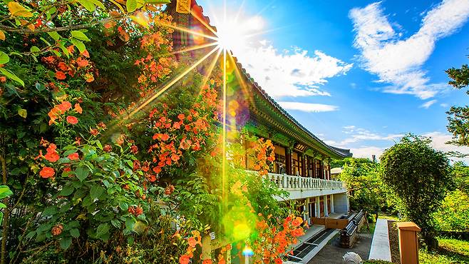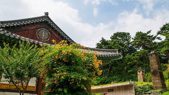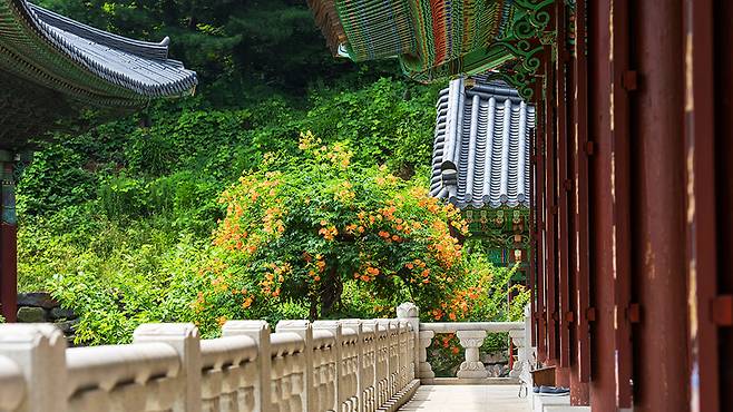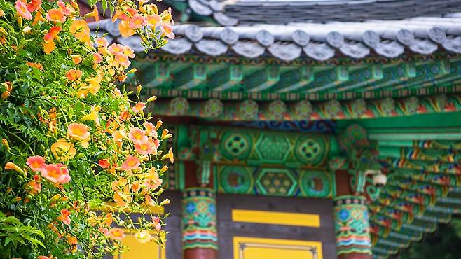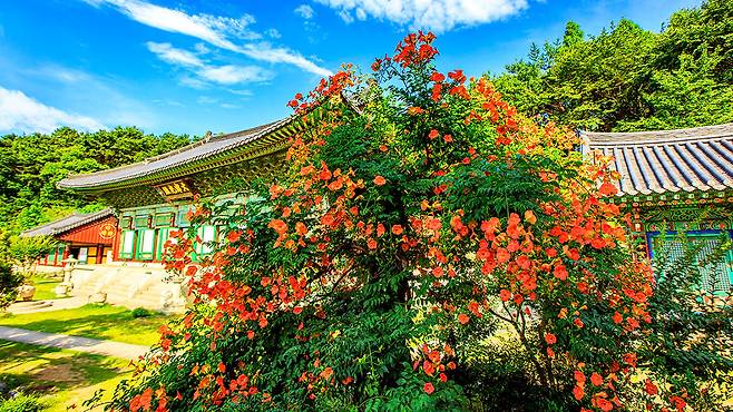 무더위가 시작되는 여름, 자연 속에서 조용한 힐링을 찾고 싶다면 주홍빛 능소화가 흐드러지게 피어나는 절집을 떠올려보자.