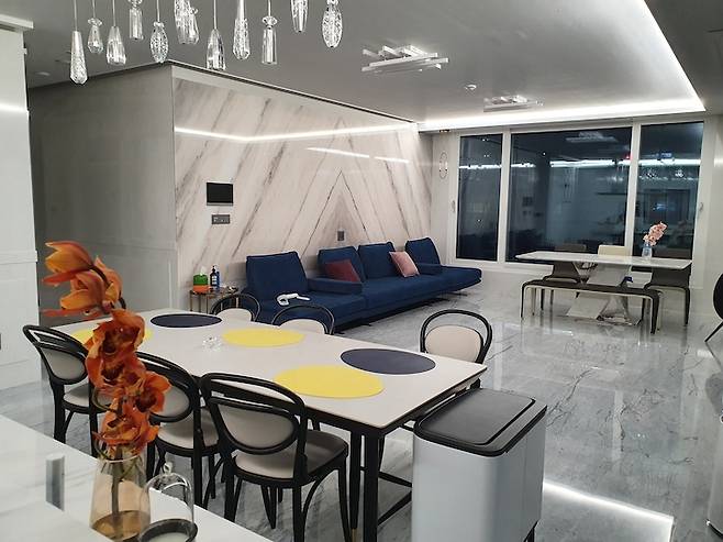 저희 집은 긴 복도 형 집이에요. 바닥도 대리석이고 벽도 전체 대리석 이라서 관리가 조금 어렵긴 하지만 복도형이라 갤러리 같고 너무 예뻐요!