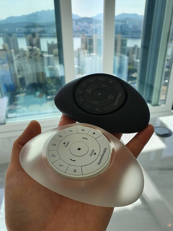 조약돌 모양의 귀여운 리모컨이에요. 어린 아이들이 있는 집이라서 무소음 전동 블라인드를 설치했어요.