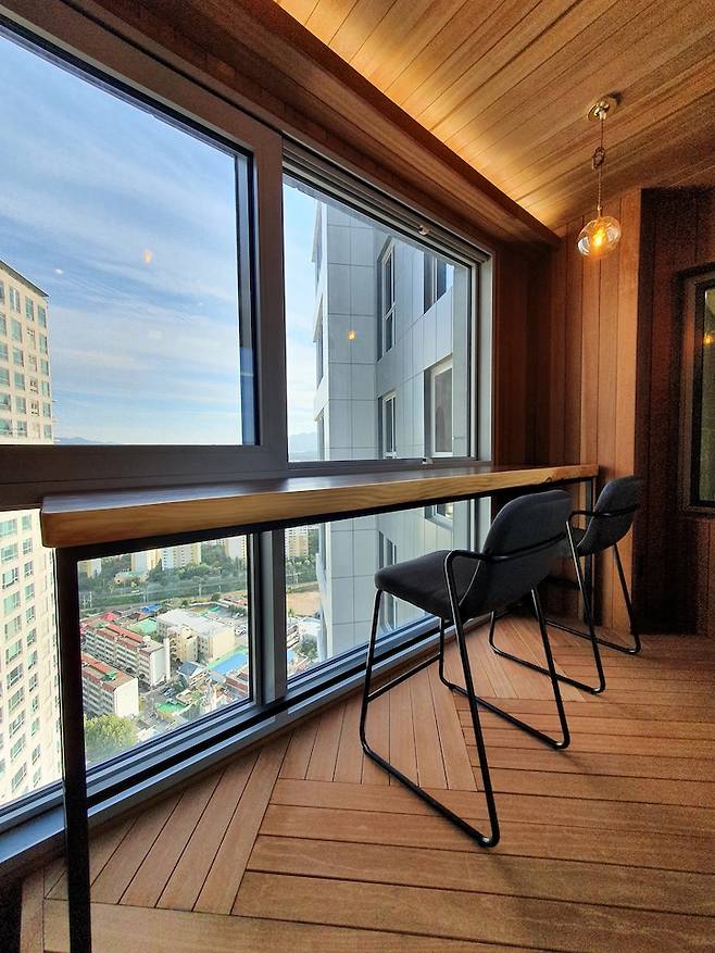 안방 테라스도 호텔 느낌 낭낭하게 주기 위해 고층 바 느낌을 주고 싶었어요.
