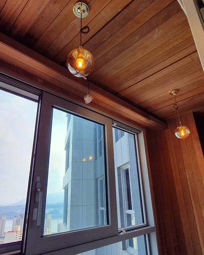 저녁에 와인 한잔 하기에 딱! 좋은 공간이에요~ 우리 집에서 한강이 제일 잘 보이는 곳이랍니다! 천장까지 다 나무로 마감했어요!
