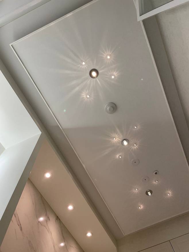 현관 천장 센서등이 정말 예뻐요 제가 가장 좋아하는 공간이에요~ 조명이 순차적으로 들어오는데 별빛이 반짝이는 것처럼, 착.착.착! 외출하거나 들어올 때 너무 기분이 좋아서 정말 호텔에 들어오는 기분이 들거든요~