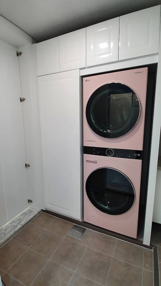 세탁기와 건조기 옆으로 청소기와 각종 청소 도구가 수납장 안에 진열되어 있고 그 위로도 수납 공간이 또 있어요!