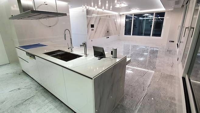 전체 대리석으로 집 분위기를 환하게 다 바꾸었어요! 벽까지 다 천연 대리석으로 바꿔주었습니다.