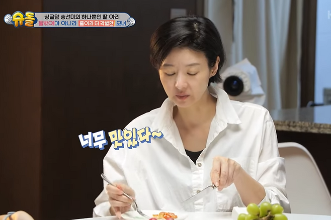 방송 속 송선미는 딸 아리에게는 다양한 재료로 만든 피자를 함께 준비해주면서도, 자신은 조용히 채소만 챙겨 먹었다.