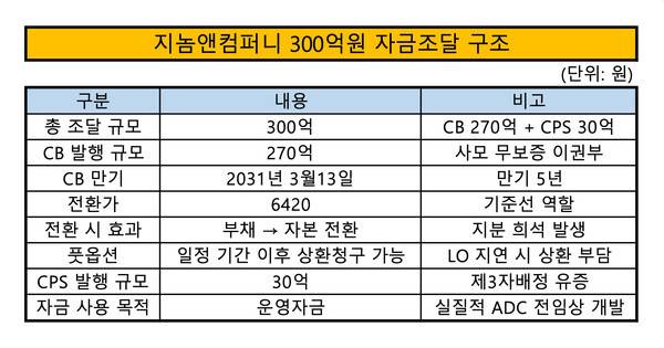 10일 금융감독원 전자공시시스템에 따르면 지놈앤컴퍼니는 6일 이사회 결의를 통해 총 300억원 규모의 자금조달을 결정했다. 270억원은 무기명식 이권부 무보증 사모 CB 발행, 30억원은 제3자배정 유증 방식이다. CB의 만기일은 2031년 3월13일이며 유증을 통해서는 의결권부 CPS 신주 46만7287주가 주당 액면가액 500원으로 발행될 예정이다. 자금조달의 목적은 '운영자금'이다.