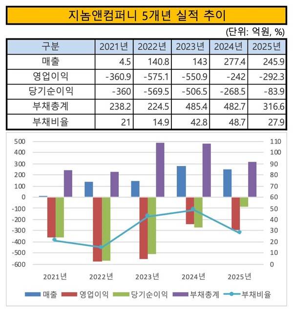 특히 외형이 유지됐지만 수익성은 개선되지 않았다는 점이 자금조달의 촉진 요인으로 꼽힌다. 2024년 연결기준 매출은 277억5000만원으로 2023년 143억원 대비 94.1% 증가했다. 다만 2025년 매출은 245억9000만원으로 다시 11.4% 감소했다. 영업손실은 2023년 550억9000만원에서 2024년 242억원으로 축소됐지만 2025년에는 292억3000만원으로 확대됐다. 실질적인 영업 기반의 흑자전환은 아직 확인되지 않았다.
