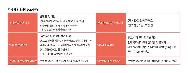 그렇다면 주택 임대차 계약 신고제란 무엇일까요? 집을 임대·임차하는 계약이 이뤄졌을 경우 이 내용을 지방자치단체에 반드시 신고하도록 한 제도입니다. 2021년 6월부터 계도 기간을 가졌고 올 6월 1일부터 정식 시행되죠. 이때부턴 신고가 의무가 됩니다.