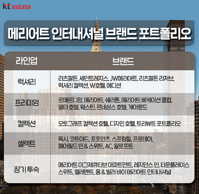 그중에서도 일반인 사이에선 역시 1위를 차지한 메리어트 인터내셔널에 관한 관심도가 높은 편인데요. 메리어트 인터내셔널은 전 세계에서 가장 큰 규모의 호텔 그룹으로 보유한 브랜드만 무려 30개나 된다고 알려진 바 있습니다. 일례로 르메르디앙을 비롯해 JW메리어트, 리츠칼튼, W호텔, 쉐라톤, 메리어트, 그리고 목시 등 그 이름만 들어도 친숙한 브랜드가 적지 않습니다.