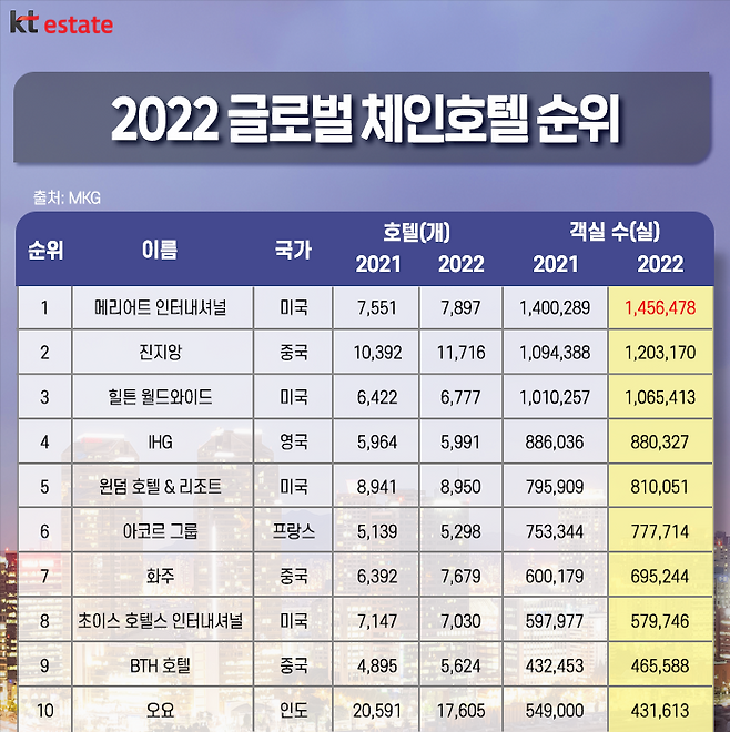 글로벌 컨설팅 업체인 MKG에서는 매년 전 세계의 체인호텔을 대상으로 글로벌 체인호텔 순위를 조사하는데요. ‘2022 글로벌 체인호텔 순위’에 따르면 1위는 총 7897개 호텔, 객실 145만6478실을 보유한 메리어트 인터내셔널(미국)이 차지한 것으로 나타나 화제가 됐습니다.