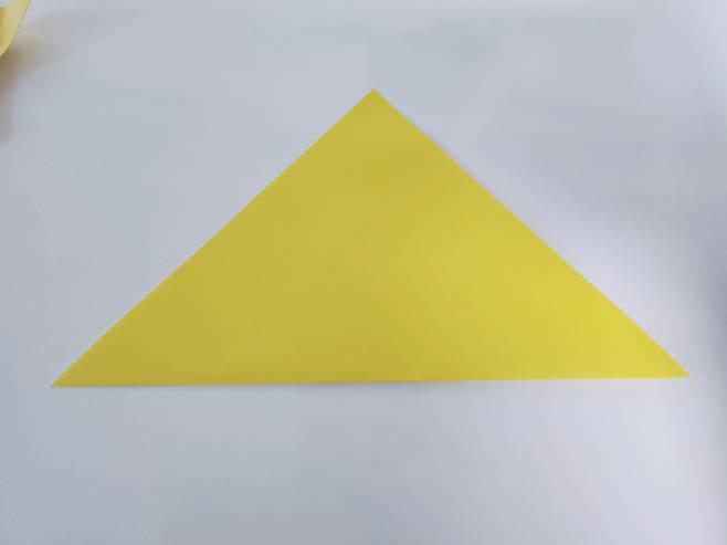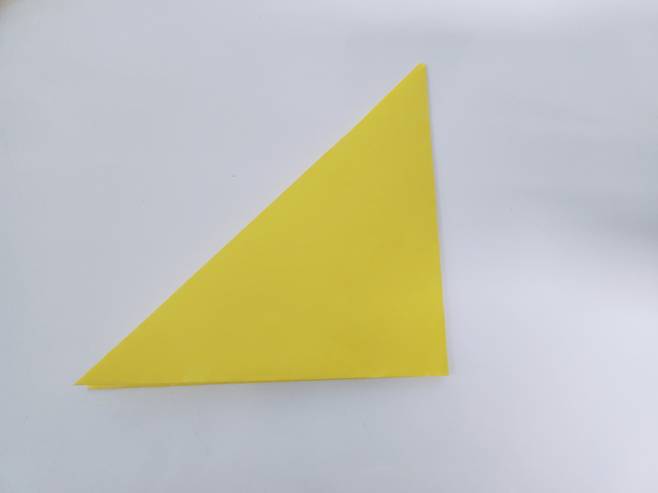 색종이의 한쪽 모서리 끝을 다른 모서리 끝에 맞춰 삼각형 모양으로 접어주세요.