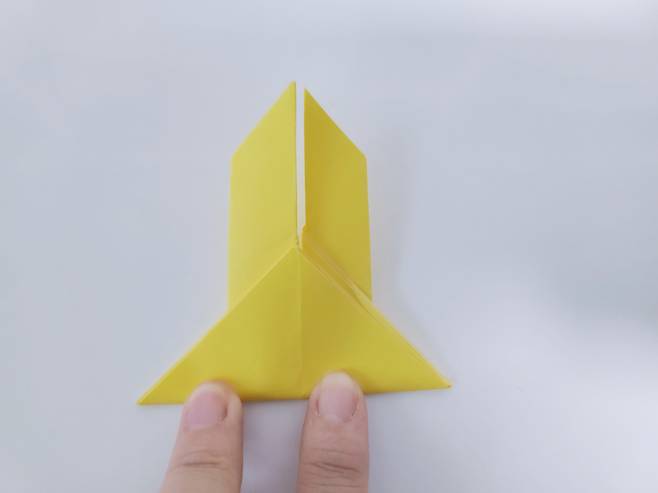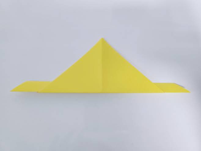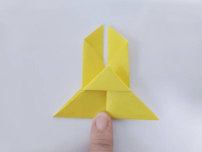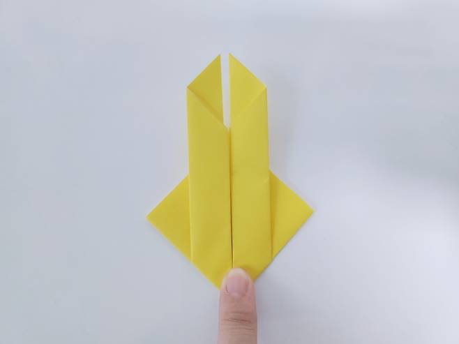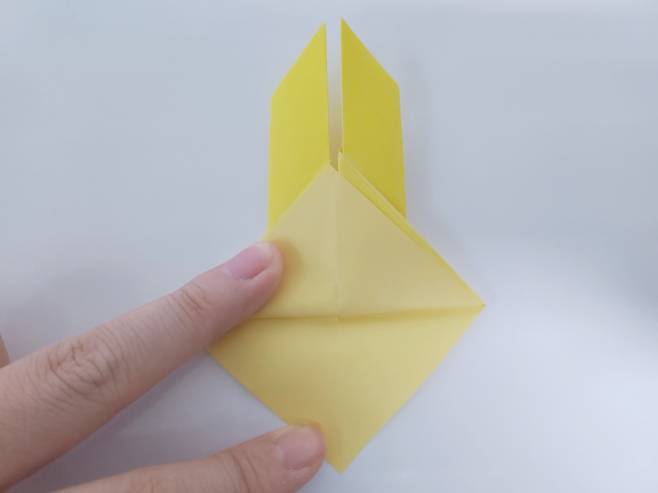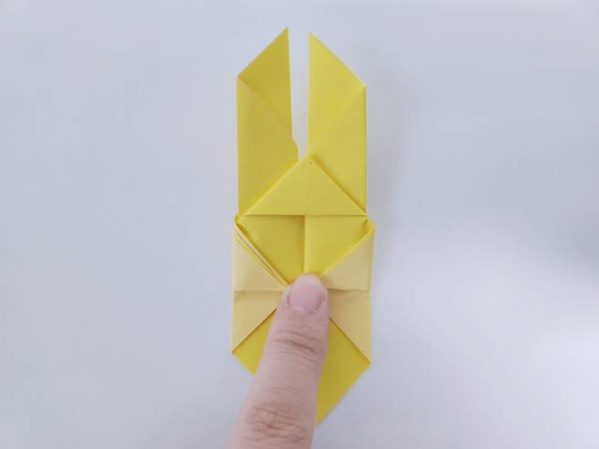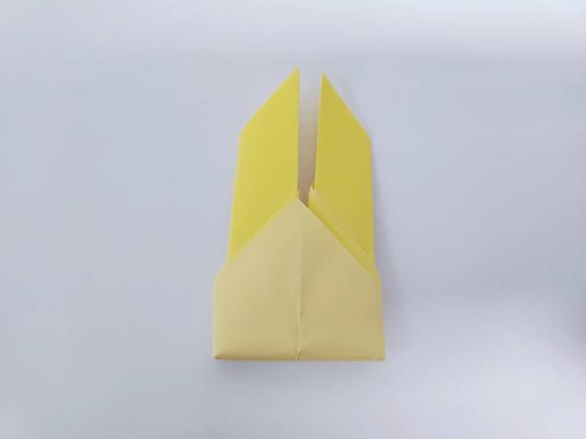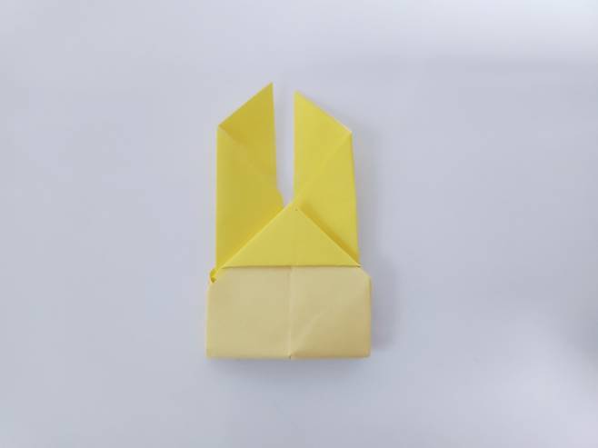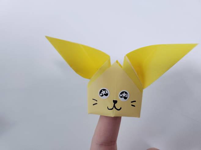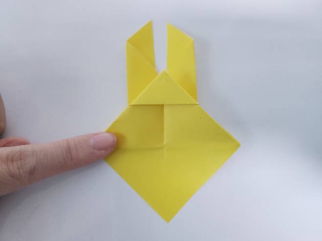 중심 선에 맞게 색종이를 안쪽으로 접어 올려주세요. 그럼 이렇게 토끼 얼굴 같은 모양이 된답니다.