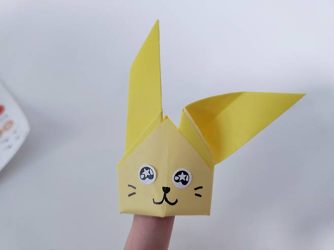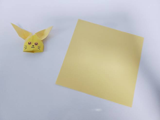 다시 색종이를 뒤집어주세요. 여기까지가 토끼 얼굴이랍니다.