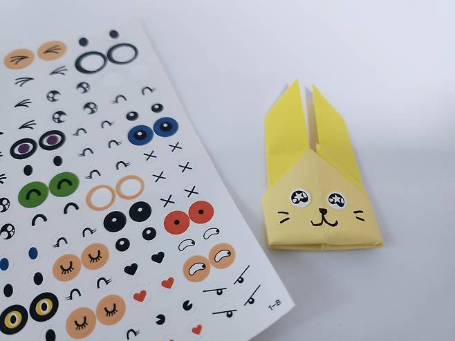 그다음 눈 스티커와 네임펜으로 토끼 얼굴을 자유롭게 꾸며주세요.