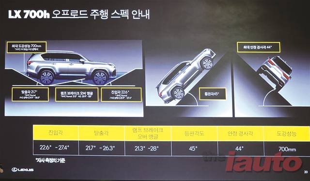 신차발표와 함께 시승행사를 진행한 디 올 뉴 LX 700h는 신뢰성, 내구성, 오프로드 주행 성능을 유지하면서도 전동화를 실현하기 위해 새로운 병렬 하이브리드 시스템을 개발했다. 파워트레인은 3.5L V6 트윈 터보 엔진과 10단 자동 변속기 사이에 클러치가 포함된 모터 제너레이터를 배치해 엔진과 모터의 강력한 출력과 토크를 효과적으로 노면에 전달한다. 이를 통해 최고출력은 합산 458마력(엔진 409마력)과 최대토크 66.3kgm을 통해 0-100km/h 가속성능은 6.5초에 복합연비는 8km를 보여준다.