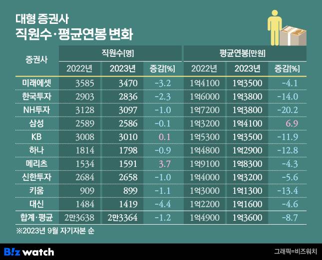 증권사 자기자본 상위 10곳(미래에셋, 한국투자, NH투자, 삼성, KB, 하나, 메리츠, 신한투자, 대신, 키움증권)의 2023년도 사업보고서를 분석한 결과, 직원들의 1인당 평균 연봉은 1억3600만원으로 전년대비 8.8% 감소한 것으로 나타났다.