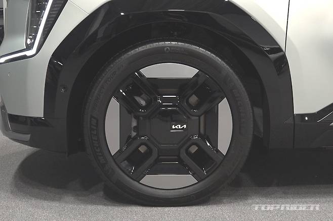삼각형 형태의 휠 아치는 EV9의 유니크한 디자인 요소 중 하나다. 후면부는 다각형 디자인과 넓고 곧게 뻗은 매끈한 면으로 기아만의 감성이 유지됐다. 실내는 E-GMP 강점 중 하나인 플랫 플로어를 바탕으로 공간감과 간결함, 직관적인 요소, 하이테크 럭셔리가 극대화됐다.