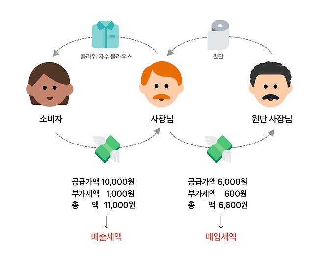 블라우스를 하나 산다고 가정해 볼게요. 옷을 판매한 사장님에게는 이윤(부가가치)이 남아요. 사장님에게 원단을 판 원단 사장님에게도 이윤이 남고요. 이렇듯생산과 유통 전 과정에서 부가가치가 발생하게 되는데 이 부가가치에 대한 세금을 부가세라고 해요.