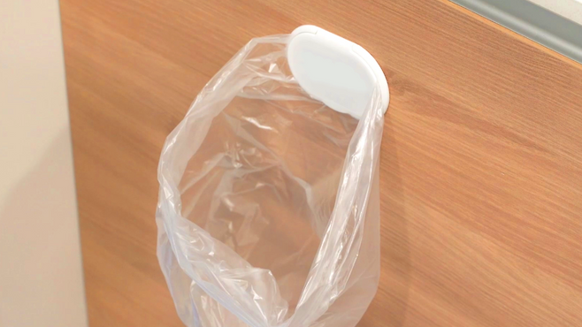 싱크대 하부장이나 문 안쪽에 뚜껑을 붙이고 비닐봉지를 끼워 미니 쓰레기통으로 활용하면 조리 중 발생하는 쓰레기를 간편하게 처리할 수 있습니다. 깔끔한 주방 환경 유지에도 도움이 되죠.