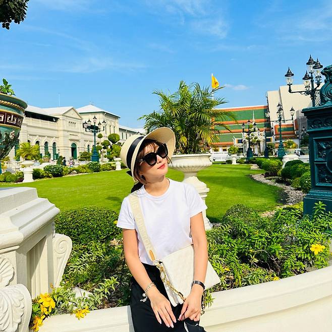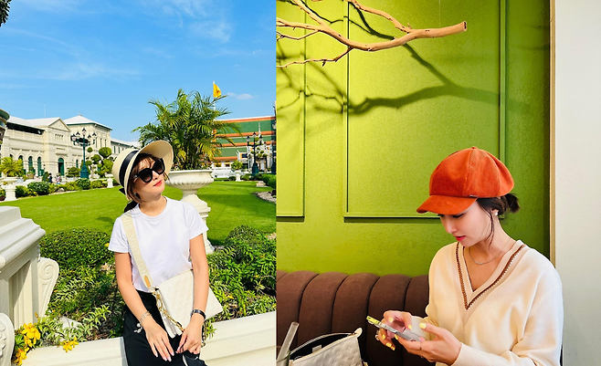 첫 번째 사진에서는 화이트 티셔츠와 블랙 팬츠의 조합으로 미니멀하면서도 시원한 느낌을 자아낸다. 스트라이프 패턴의 모자는 햇볕을 가리는 동시에 스타일 포인트로 활용되었으며, 크림색 숄더백은 전체적인 색조를 조화롭게 맞추며 실용성을 더했다. 이인혜는 자연스러운 배경 속에서 편안하고 여유로운 모습을 보여준다.