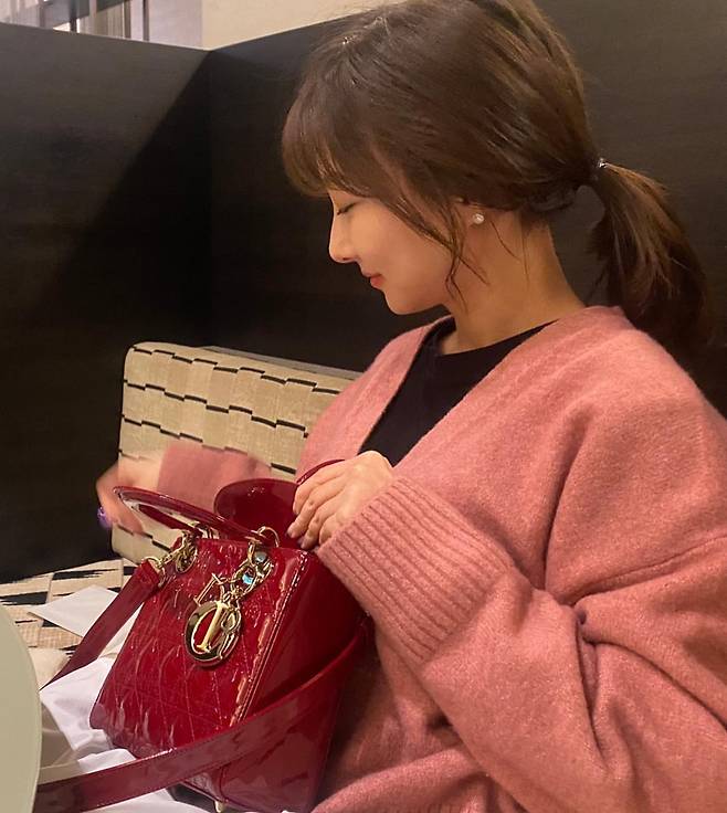 세 번째 사진에서는 부드러운 핑크색 니트 가디건과 블랙 이너웨어를 매치해 차분하면서도 고급스러운 분위기를 연출했다. 그녀가 들고 있는 레드 컬러의 디올 백은 강렬한 포인트로 작용하며, 전체적인 룩에 생기를 더한다. 작은 진주 귀걸이와 자연스럽게 묶은 헤어스타일은 우아함을 더하는 요소로 눈길을 끈다.
