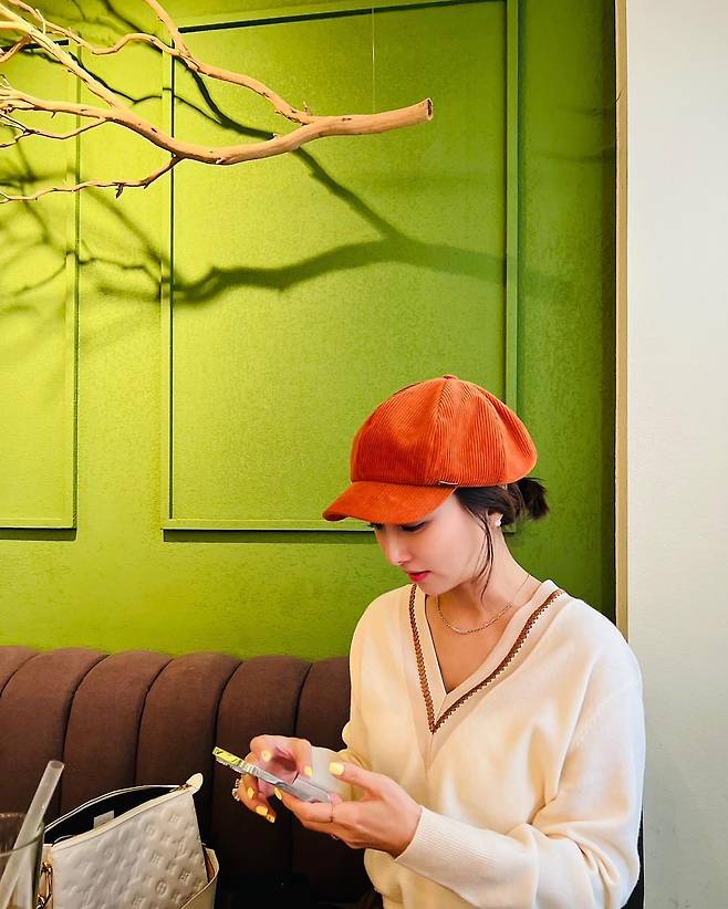 두 번째 사진에서 이인혜는 따뜻한 크림색 니트와 브라운 포인트가 들어간 브이넥 디자인으로 편안하면서도 세련된 분위기를 연출했다. 오렌지 컬러의 코듀로이 캡은 룩에 활기를 더하며, 네온 컬러 네일과 작은 액세서리들이 전체적인 스타일을 더욱 돋보이게 한다. 그녀가 들고 있는 화이트 가방은 깔끔한 무드를 유지하면서 실용성을 강조한다.