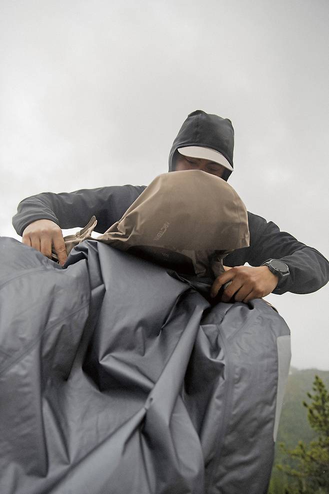 아크테릭스 관계자의 의도였는지 모르겠지만, 하이킹하는 날에만 비가 억수같이 쏟아졌다. “저희가 준비한 옷을 입고 코스트산맥을 함께 탐험해봐요.” 관계자의 말에 따라 그들이 자랑하는 레이어링 시스템에 입각해 겹겹이 옷을 입고 코스트산맥을 올랐다. 분명 초보자 코스라고 했는데, 유독 길이 아닌 밀림으로 우리를 안내했다. 계곡에 당도할 때마다 제대로 된 다리가 없어 쓰러진 나무를 밟고 건너야만 했고 가파른 바위를 넘기 위해 하네스를 차고 암벽을 타야 했다. “조금만 힘내요. 이제 곧 정상이에요.” 아크테릭스 관계자와 이번 하이킹의 길잡이 역할을 한 탐험가는 밴쿠버인들은 이 정도는 가뿐하다는 표정으로 지친 기색 하나 없이 산을 타며 말했다. 기어코 오른 정상에서 보이는 건 아무것도 없었다. 비의 영향인지 안개로 가득했다. 내가 얼마나 높이 올라왔는지조차 도무지 짐작할 수 없었다.