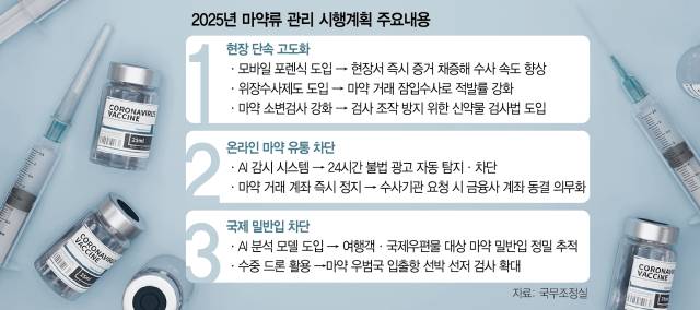 정부는 올해 마약 거래·유통 현장에서의 단속 역량을 크게 끌어올린다는 목표를 세웠다. 검찰은 모바일 포렌식 기술을 도입해 현장에서 즉시 디지털 증거를 확보하고 수사 속도를 높일 방침이다. 경찰은 연내 위장 수사 제도 도입을 위한 법적 근거를 마련해 수사기관이 위조 신분증을 사용하거나 신분을 숨긴 채 마약 거래에 잠입할 수 있도록 할 계획이다.