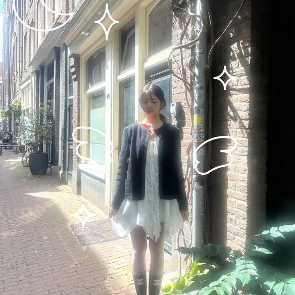 셀카마다 분위기에 맞는 스티커와 그림을 활용해 마치 그 시절 스티커 사진의 y2k 무드를 그대로 재현해 내는 레 이. 귀여운 고양이나 인형 등을 적절하게 활용하는 게 포인트!