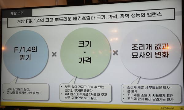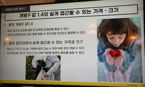F/1.4 밝기를 구현하기 위해서는 설계 난이도가 높지만 얕은 피사계 심도를 살려 큰 보케와 입체감을 즐길 수 있으면서도, 평상시 가지고 다니는 가방에 넣어서 부담없이 꺼낼 수 있고 추가로 1개 더 가지고 다니기 적합한 가격과 크기를 고려했다.