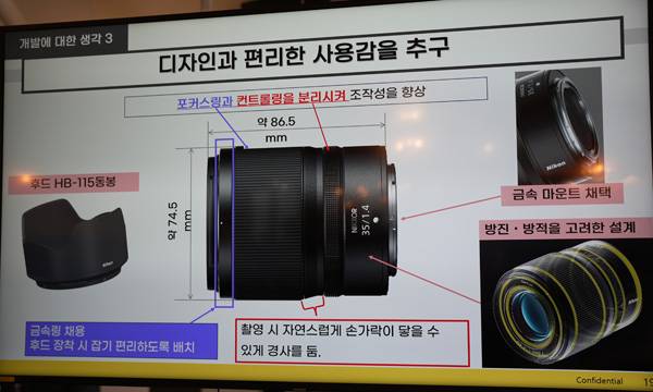Z6III보다도 뒤에 발표된 최신 렌즈 NIKKOR Z 35mm f/1.4을 소개한 니콘 광학본부 제3설계부 타케 토시노리 제2광학과장은 밝은 개방 조리개 F값 1.4의 배경 흐림 표현을 부담없이 즐길 수 있는 휴대하기 좋은 광각 단초점 렌즈를 신제품 개발 컨셉으로 잡았다고 밝혔다.