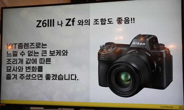 타케 토시노리 과장은 NIKKOR Z 35mm f/1.4 단초점 렌즈가 카메라 키트에 포함되는 번들 줌 렌즈로는 느낄 수 없는 배경 흐림 및 조리개값에 따른 묘사와 변화를 즐길 수 있는 제품이며 새로 출시된 Z6III는 물론 레트로 디자인의 가벼운 풀프레임 미러리스 카메라 Z f와도 잘 어울리는 조합이라고 덧붙였다.