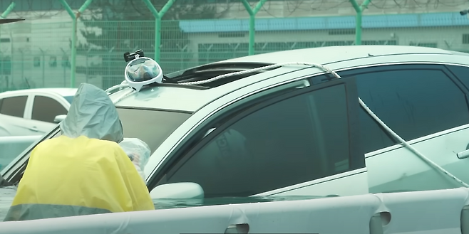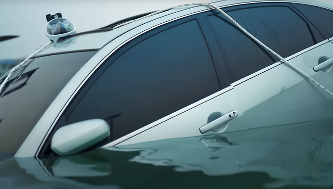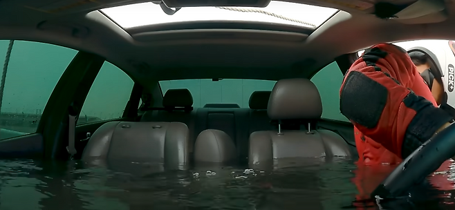 우선 서서히 침수가 이루어지는 과정을 재연해 보았을 때 차량이 일부가 잠긴 상태라면 아무리 힘을 주어도 문이 열리지 않는 모습을 볼 수 있었는데, 차량 내외부 수위 차이가 30cm 이상일 경우라면 일반적인 성인 남성도 문을 열기가 힘들다고 합니다.