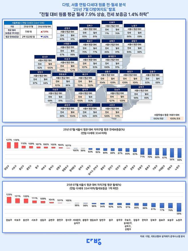 26일 부동산 정보 플랫폼 다방이 발표한 '7월 다방여지도'에 따르면 올 7월 기준 서울지역 연립·다세대 원룸(전용면적 33㎡ 이하)의 보증금 1천만원 기준 평균 월세는 73만원이었다.