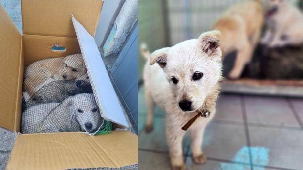 발견 당시 강아지들은 작은 상자에 옹기종기 들어가 있는 상태였다. 게다가 강아지들이 스스로 나가지 못하게 하려고 했었는지, 망으로 한번 더 싸서 유기된 모습이다.