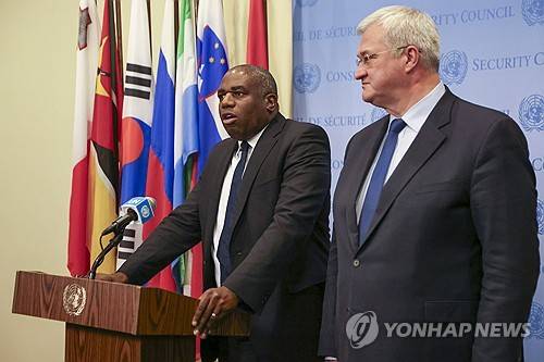 epa11728075 Foreign Secretary of the United Kingdom David Lammy (L) speaks during a press conference next to Minister for Foreign Affairs of Ukraine Andrii Sybiha (R) before a Security Council meeting in New York, New York, USA, 18 November 2024. The council discussed the war in Ukraine after the 1000 day anniversary. EPA/SARAH YENESEL