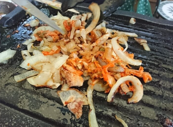 삼겹살을 먼저 구우면 자연스럽게 고기 기름이 나온다. 이 기름은 볶음밥의 풍미를 만드는 중요한 요소가 된다. 별도의 식용유를 넣지 않아도 고기 기름만으로도 충분히 볶음밥을 만들 수 있다.