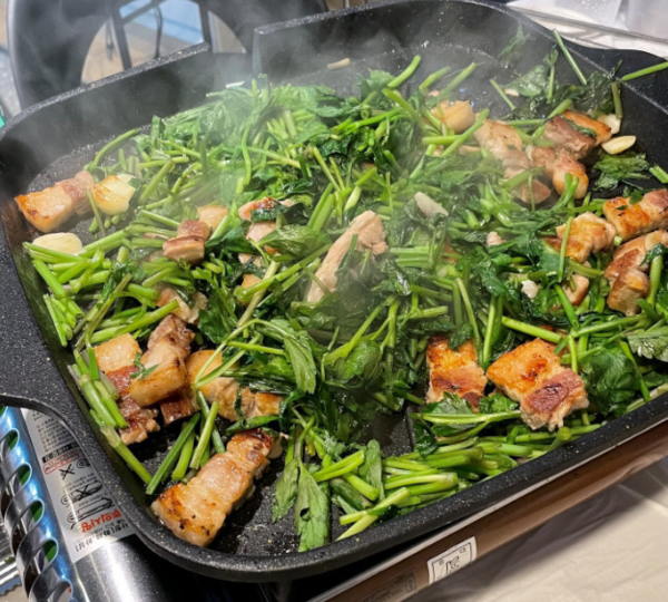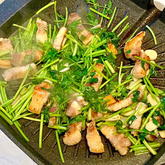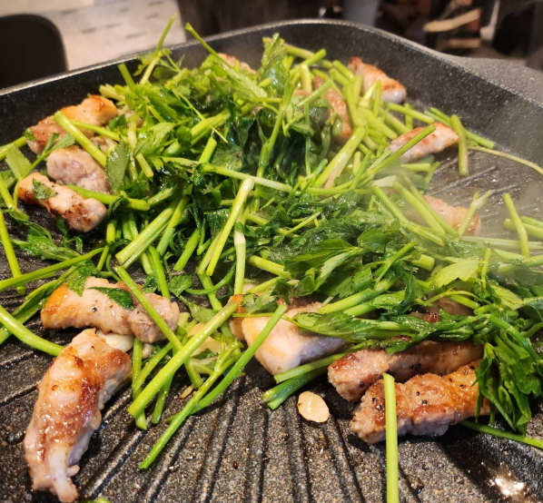 이 요리는 삼겹살의 고소한 기름과 미나리의 향을 동시에 즐길 수 있는 메뉴다. 미나리를 마지막에 넣어 향을 살리는 것이 중요한 포인트다.