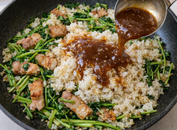 그다음 양념장인 돈까스소스 1큰술, 설탕 1큰술, 고춧가루 1큰술, 다진 마늘 반 스푼, 물 소량을 넣어 고기에 잘 스며들도록 볶는다. 이후 밥을 넣고 골고루 볶아 준 뒤 마지막에 미나리 잎 부분을 넣어 가볍게 섞는다. 마무리로 참기름을 살짝 둘러주면 미나리 삼겹볶음밥이 완성된다.