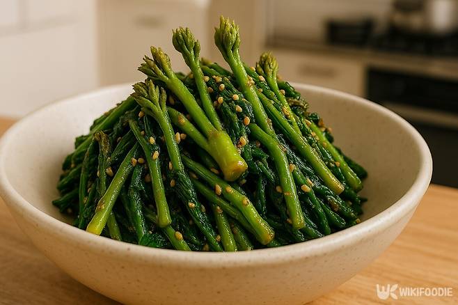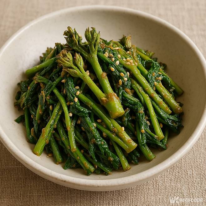 이때 데친 후 찬물에 오래 담가두면 쓴맛을 줄일 수 있고, 참기름을 넉넉히 쓰면 풍미가 더 살아난다.