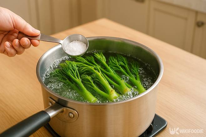 2. 끓는 물에 굵은소금 1T를 넣고 줄기부터 넣어 1분간 데친다.