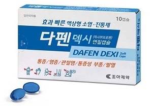 다펜덱시연질캡슐(덱시부프로펜)은 1회 300mg을 1일 2~4회 경구 투여한다. 의사의 처방 없이 약국에서 구매할 수 있다.