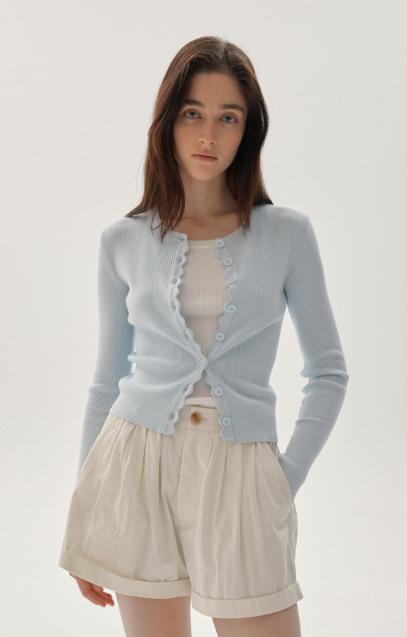 크루넥 라인과 버튼단작에 더해진 웨이빙 포인트가 사랑스러운 디테일을 더하며, 골지 조직감이 가녀리면서도 여성스러운 실루엣을 완성한다.
