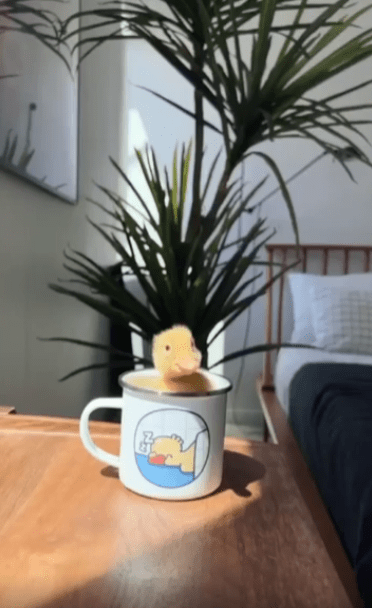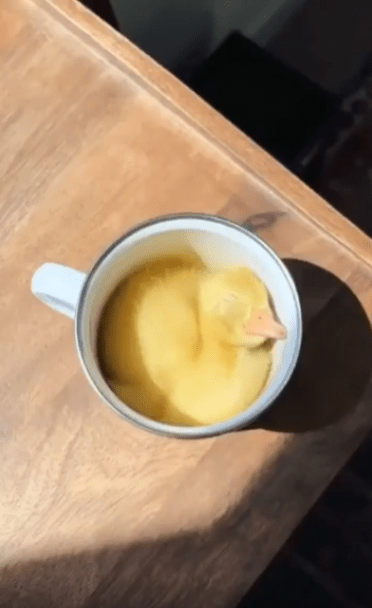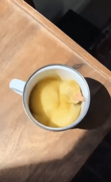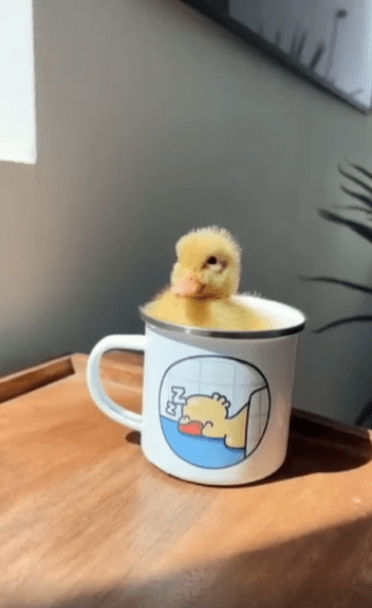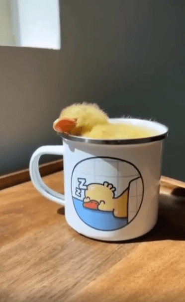 컵 하나와 새끼 오리 하나. 아주 단순한 조합이지만, 그 안에는 세상의 모든 따뜻함과 포근함이 가득 담겨 있습니다. 보는 사람의 입가에 절로 미소가 번지는 순간이었지요.