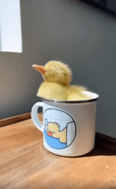 테이블 위 작은 컵 안에서 졸음을 참다 결국 잠이 들어버린 새끼 오리—세상에서 가장 포근한 휴식