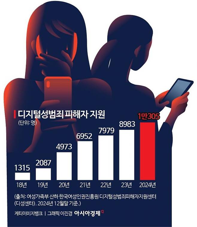 11일 여성가족부와 한국여성인권진흥원에 따르면 2024년 12월 말 기준 '디지털 성범죄 피해자 지원센터(디성센터)'에서 지원받은 피해자는 1만305명으로 전년(8983명)보다 14.7% 늘었다. 피해자가 1만명을 넘은 것은 2018년 4월 여가부가 디지털 성범죄 피해 확산을 방지하기 위해 디성센터를 설치한 이후 처음이다. 개소 당시 1315명에서 6년 새 9배 늘었다.